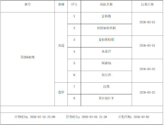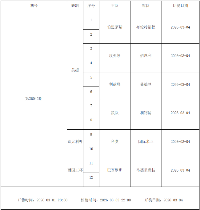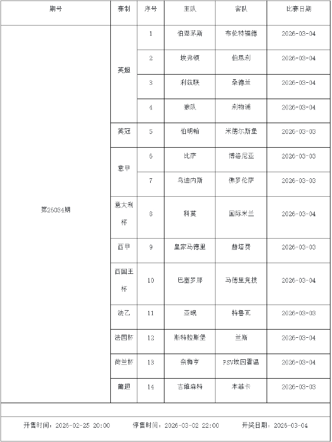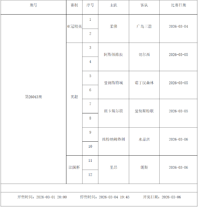 我中心制定了2026年中国足球彩票胜负游戏(14场、任选9场)、6场半全场胜负游戏和4场进球游戏2月27日-3月5日的竞猜场次安排(具体附后),其竞猜对象、开售时间、停售时间和计奖时间均以本文为准。