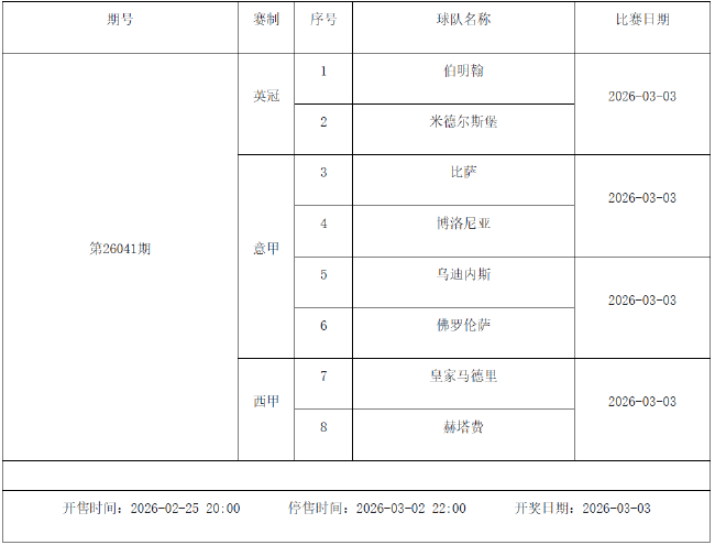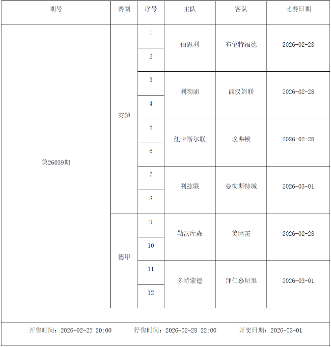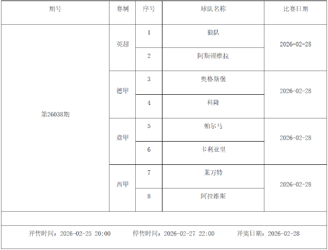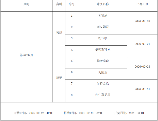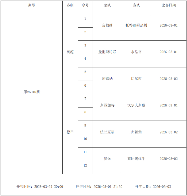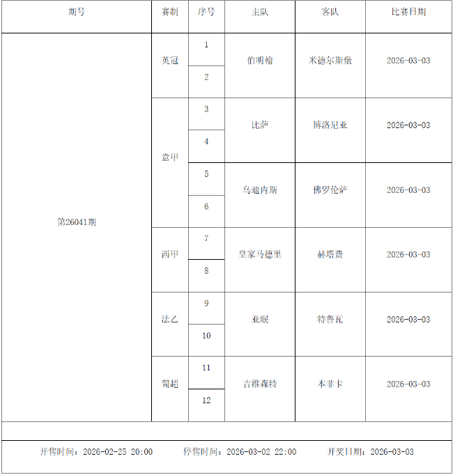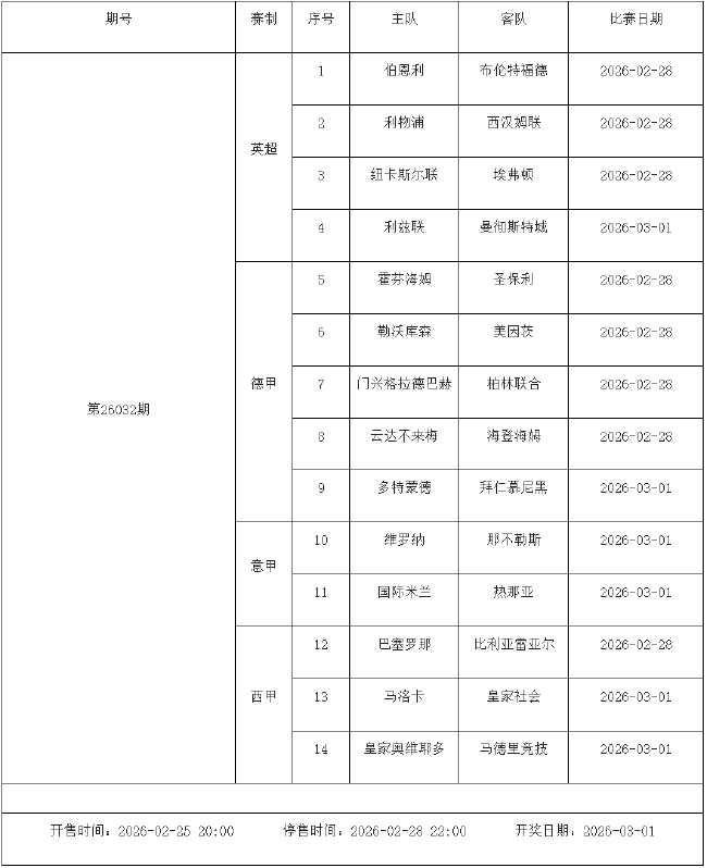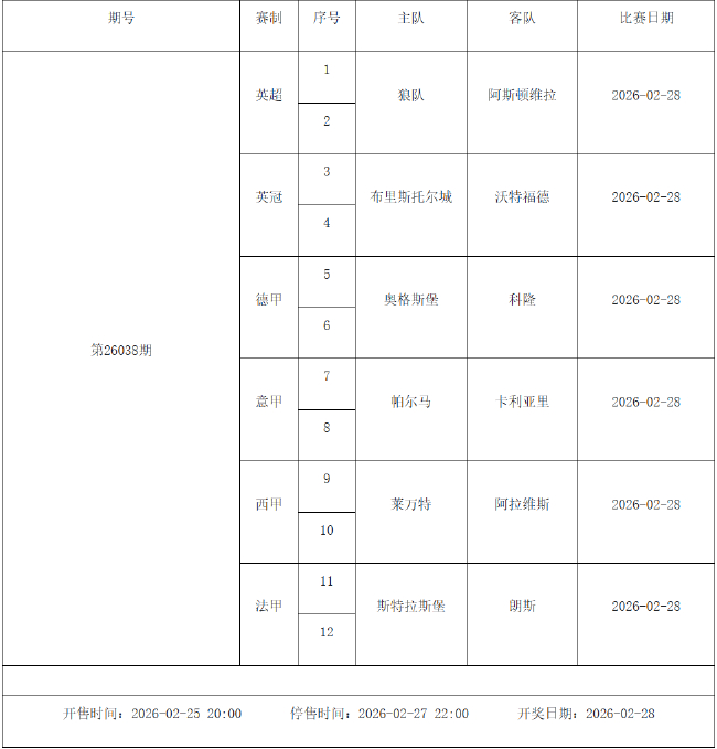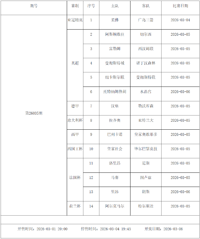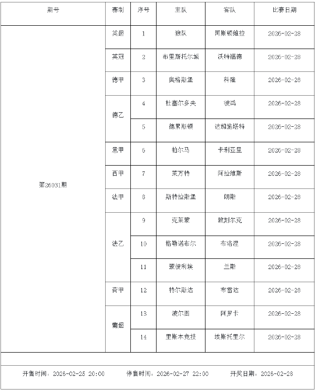 北京时间2026年2月24日,国家体彩中心公布了2026年2月27日-3月5日的足彩赛程,2月27日(周五)、2月28日(周六)、3月1日(周日)、3月2日(周一)、3月4日(周三)共5期。其中26031期包含英超英冠德甲等10大赛事混猜、第26032期、26033期由欧洲五大联赛组成、26034期竞猜英超英冠意甲意大利杯等10大赛事、26035期由亚冠精英英超德甲等8大赛事组合。